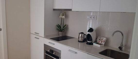 Large kitchen with oven, dishwasher, espresso machine, refrigerator, vacuum cleaner, microwave, iron, drying rack, etc., own washing machine and dryer